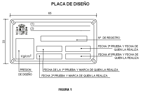 El extintor irá provisto de una placa de diseño (ver figura 1), que llevará grabados los siguientes datos:Presión de diseño (presión máxima de servicio).