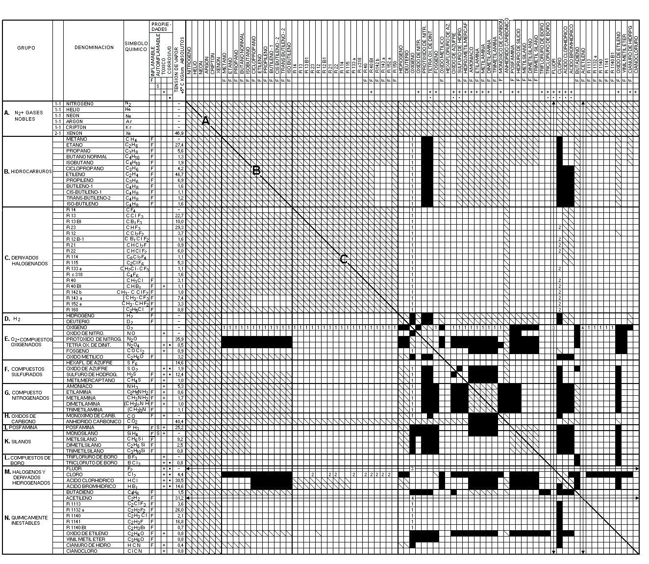 -Los gases están ordenados en 12 grupos, en función de su analogía química. Existe un 13° grupo (N) que integra a los gases químicamente inestables.
