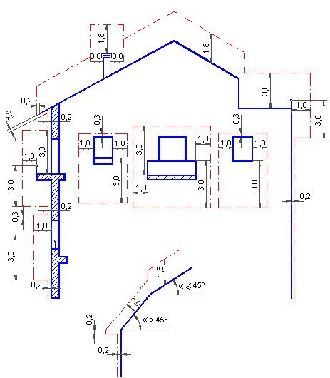 b) En edificios, no destinados al servicio de distribución de la energía, los conductores se instalarán al exterior de una zona de protección limitada por los planos que se señalan: