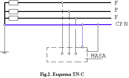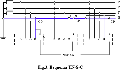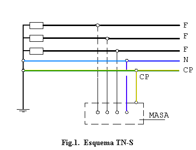 - Esquema TN-S : En el que el conductor neutro y el de protección son distintos en todo el esquema ( fig. 1 ).