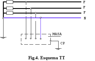 TT tiene un punto de alimentación, generalmente el neutro o compensador, conectado directamente a tierra. Las masas de la instalación receptora están conectadas a una toma de tierra separada de la toma de tierra de alimentación (fig. 4).