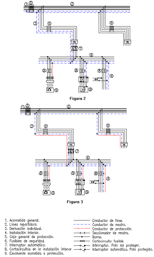 - Todas las masas de una instalación deben estar unidas al conductor neutro a través de un conductor de protección. La unión de este conductor con el conductor neutro se realizará en un solo punto situado inmediatamente antes del dispositivo general de protección de la instalación o antes de la caja general de protección (Instrucción MI BT 012). Las figuras 2 y 3 representan esquemas de estas conexiones.