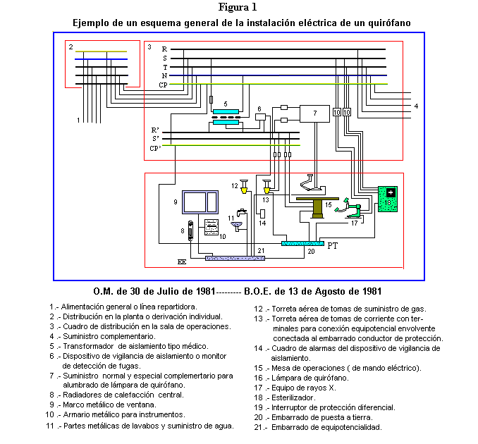 Se prescribe, además, disponer de un suministro especial complementario, a base de, por ejemplo, baterías, para hacer frente a las necesidades de la lámpara de quirófano y equipos de asistencia vital, debiendo entrar en servicio en menos de 0,5 segundos. La lámpara de quirófano siempre será alimentada a través de un transformador de seguridad (ver fig. 1).