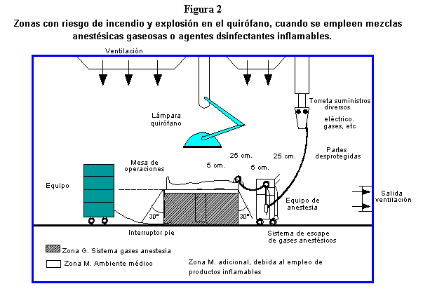La figura 2 muestra las zonas G y M, que deberán ser consideradas como zonas de la Clase Y división 1 y Clase Y división 2, respectivamente, y tratadas como tales según el vigente Reglamento para Baja Tensión (MI BT 026). La zona M, situada debajo de la mesa de operaciones (ver fig. 2), podrá considerarse como zona sin riesgo de incendio o explosión cuando se asegure una ventilación de 15 renovaciones/hora de aire.