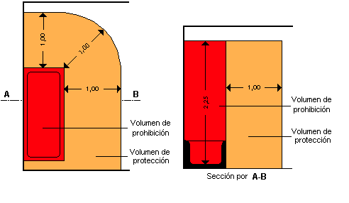 - Volumen de protección. - Es el comprendido entre los mismos planos horizontales señalados para el volumen de prohibición y otros verticales situados a 1,00 metro de los del citado volumen. La figura 1 señala estos volúmenes.