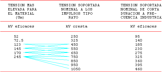 3.3.3 La tabla 7 indica en la primera y segunda columnas las tensiones soportadas a impulsos tipo maniobra fase-tierra y entre fases y en las columnas tercera y cuarta las distancias al aire entre conductores paralelos y entre punta y conductor.