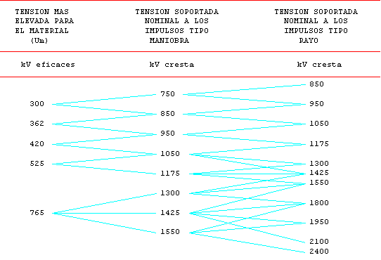 Esta tabla da las combinaciones recomendadas entre las tensiones más elevadas para el material y el nivel de aislamiento. Cuando, debido a las características de la red, o a los métodos elegidos para controlar las sobretensiones de maniobra o de rayo el empleo de combinaciones distintas a las de la tabla quede justificado técnicamente, los valores seleccionados deben tomarse de entre los que figuran en la tabla.
