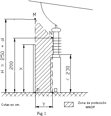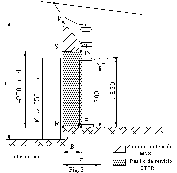 3.2.2 Teniendo en cuenta estas distancias mínimas así como la altura libre en las zonas accesibles señaladas en el apartado 3.1.5, la zona total de protección que deberá respetarse entre los sistemas de protección y los elementos en tensión se representará rayada en la figura 1, con las acotaciones del cuadro que la sigue: