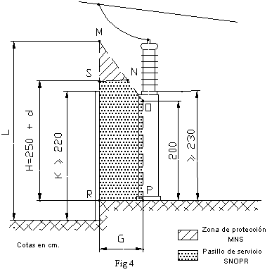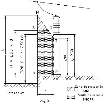 3.3.2 Si la altura sobre el suelo de la línea, de contacto del aislador con su zócalo puesto a tierra, es inferior a 230 cm no podrán establecerse, pasillos de servicio a no ser que se disponga de una protección situada entre los aparatos y el cierre exterior de modo que se cumpla simultáneamente lo indicado en el apartado 3.2 ( fig. 5 ).