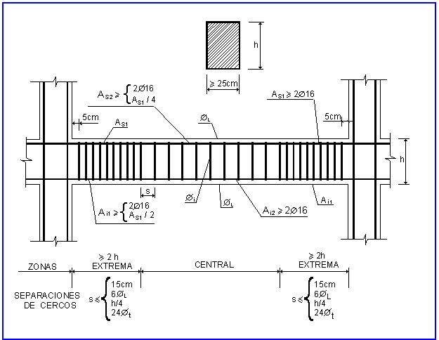 - En las zonas extremas de la viga, en una longitud igual al menos a dos veces el canto desde la cara del apoyo hacia el interior del vano, se dispondrán cercos cerrados de diámetro mayor o igual que 6 mm y separados a distancias no mayores que la menor de las siguientes:
