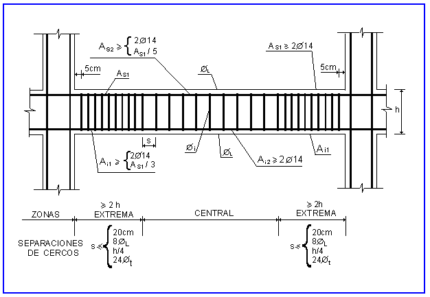 En lo que sigue se establecen unos requisitos dimensionales y de disposición de armaduras que aseguran un comportamiento de ductilidad alta para las diferentes magnitudes de la acción sísmica, de acuerdo con la experimentación disponible y el comportamiento real de estructuras sometidas a sismo.