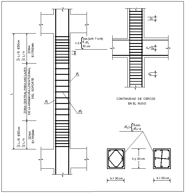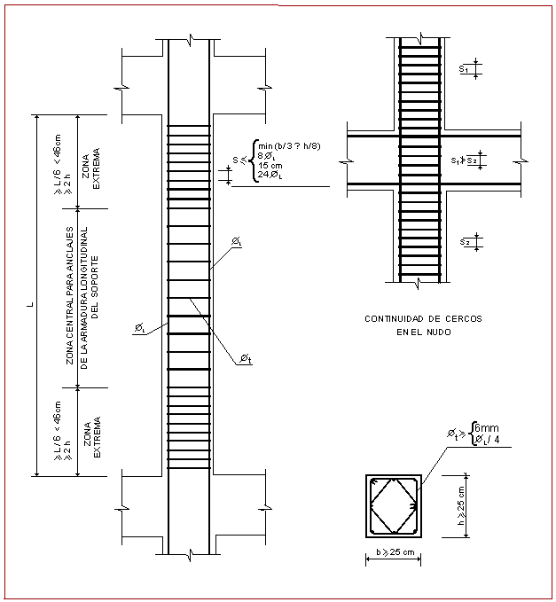 - En las zonas extremas del pilar, en una longitud mayor o igual al doble de la menor dimensión o la sexta parte de la longitud libre del soporte, se dispondrán cercos cerrados de diámetro mayor o igual a 6 mm y separados a distancias no mayores que la menor de las siguientes: