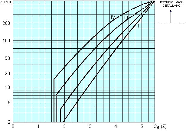 Fig. A.5 - Coeficiente de exposición ce(z) en función de la altura sobre el terreno y de la categoría del terreno