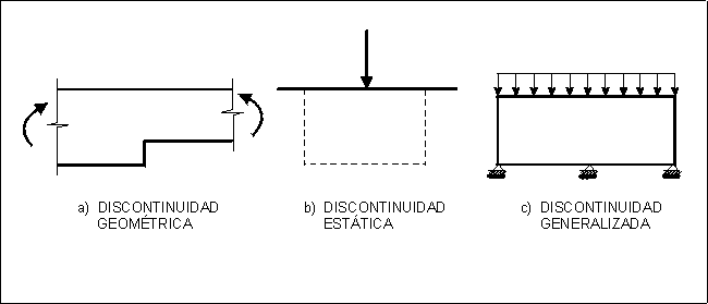Las regiones D existen en una estructura cuando se producen cambios bruscos de geometría (discontinuidad geométrica, figura 24.1.a), o en zonas de aplicación de cargas concentradas y reacciones (discontinuidad estática, figura 24.1.b). Igualmente, una región D puede estar constituida por una estructura en su conjunto debido a su forma o proporciones (discontinuidad generalizada). Las vigas de gran canto o ménsulas cortas (figura 24.1.c) son ejemplos de discontinuidad generalizada.