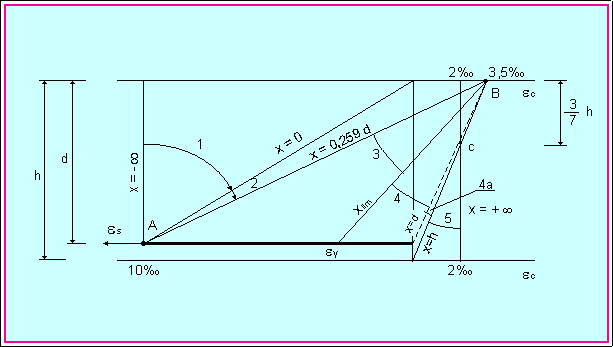 Tracción simple o compuesta en donde toda la sección está en tracción. Las rectas de deformación giran alrededor del punto A correspondiente a un alargamiento del acero más traccionado del 10 por 1000.Dominio 2: Flexión simple o compuesta en donde el hormigón no alcanza la deformación de rotura por flexión. Las rectas de deformación , giran alrededor del punto A.