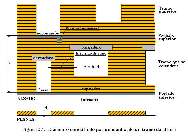 Los muros resistentes de un edificio de varias plantas se descomponen verticalmente en tramos, comprendidos entre dos forjados consecutivos. Cuando el tramo que se considera (Figura 5.1) está constituido por machos separados por huecos de puertas o ventanas, cada macho constituye un elemento.