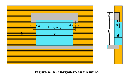 Un cargadero de canto c (Figura 5.16), excluyendo la pestaña si existe, y anchos, que forma el dintel de un hueco, de vano v, con entrega a £ c en cada apoyo, se calculará como simplemente apoyado, con la luz l = v + a, y con las cargas situadas dentro de las verticales del vano, o con la carga reducida, que se detalla en el apartado 5.7.1, cuando exista muro encima y pueda en él producirse el efecto de arco. La tensión en cada apoyo sobre la fábrica se calculará dividiendo la correspondiente reacción R de las cargas por el área A = a s.