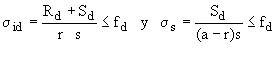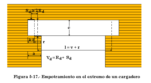 c, puede considerarse empotramiento, calculando con la luz l = v + r, siendo r ³ c, aplicando en la zona extrema, de longitud a - r, una reacción de empotramiento Sd, que estáticamente puede ser equilibrada en el muro, y verificando las tensiones producidas en la fábrica por la reacción isostática Rd de la carga, y la reacción Sd: