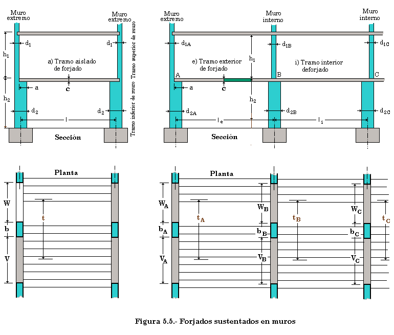 A y su altura h medida entre la base y la coronación. La base del elemento está en el arranque de cimentación, o en el supradós del forjado inferior. La coronación está en el supradós del forjado superior, en el plano de apoyo de la cubierta, o en su plano superior si el elemento es libre.Si el tramo de muro no tiene huecos, puede considerarse como elemento cada parte comprendida entre muros transversales, o la zona de un metro de anchura que tenga las cargas más desfavorables.