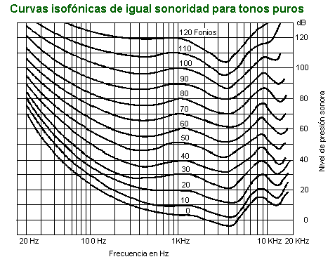 A continuación se representan las curvas de igual sonoridad para tonos puros que constituyen la base para la elaboración de las curvas de ponderación.