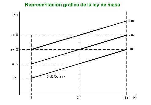 De donde se deduce que para una frecuencia fija, el aislamiento aumenta en 6 dB cuando se duplica la masa. Análogamente, para una masa dada, el aislamiento crece 6 dB al duplicar la frecuencia.