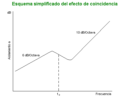 Lo expuesto en el epígrafe anterior se obtiene a partir de un modelo físico simplificado, formado por masas independientes, mientras que en la realidad la naturaleza elástica de los elementos entraña la correspondiente ligazón entre las masas. En una zona de frecuencias determinada en torno a la que se denomina frecuencia de coincidencia fc, la energía acústica incidente se transmite a través de los paramentos en forma de ondas de flexión, que se acoplan con las ondas del campo acústico produciéndose una notable disminución del aislamiento.