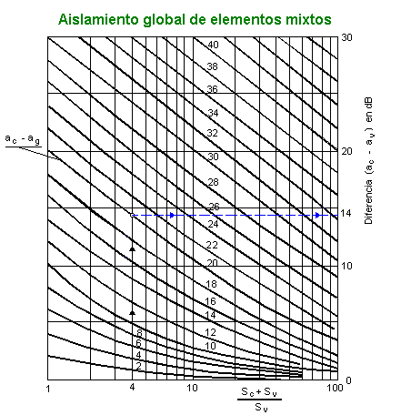 A título de ejemplo y para mostrar el uso del ábaco, para un cerramiento con ventana, con aislamiento de 20 dBA y un área del 25% del total, cuya parte ciega tiene un aislamiento de 40 dBA, se obtiene una diferencia ac - ag de 14 dBA, lo que representa un aislamiento global ag de 40 - 14 = 26 dBA.