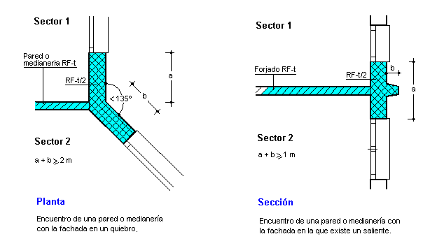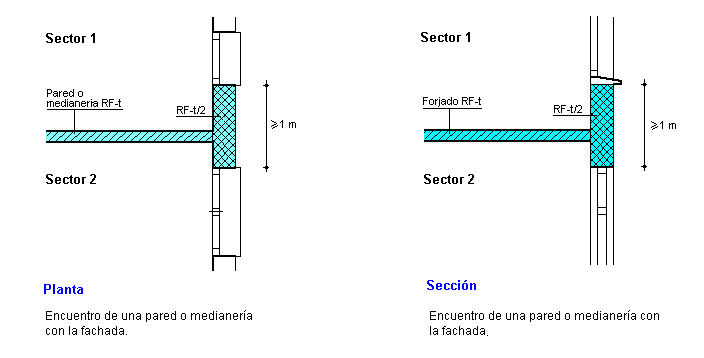2. Cuando una medianería, un forjado o una pared que compartimente sectores de incendio o que delimiten un local de riesgo especial alto de los definidos en el artículo 19, acometan a una fachada, la resistencia al fuego de ésta será al menos igual a la mitad de la exigida al elemento de que se trate, en una franja cuya anchura sea igual a 1 m.