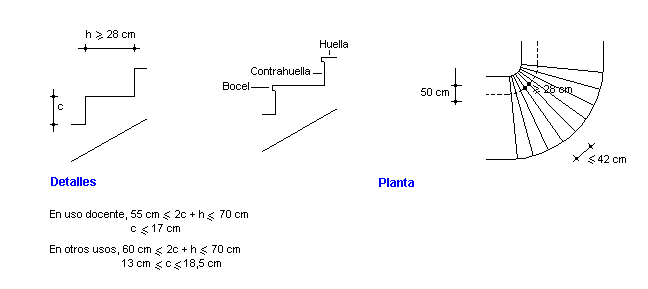 En escuelas infantiles y en centros de enseñanza primaria o secundaria, la relación c/h será constante a lo largo de toda escalera y cumplirá la relación 55 |