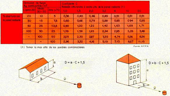 La distancia mínima que debe separar dos riesgos se calculará multiplicando la dimensión menor, ancho o alto de la pared radiante, por el coeficiente C que se deduzca de la tabla adjunta. Al producto se sumará siempre 1,5 metros (Tabla 1)