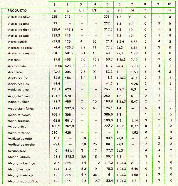 ta = punto de autoencendido (Autoignition point) en grados centígrados
