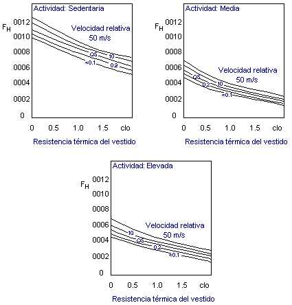 Cuando la humedad difiere de dicho valor su influencia en el IMV se tiene en cuenta mediante el empleo de los gráficos de la figura 1 donde se da el factor de corrección por humedad, FH, en función del nivel de actividad, el tipo de vestido y la velocidad relativa del aire. Si, por ejemplo, la humedad relativa es del 30%, de la figura 1 obtenemos para personas sedentarias con vestido de 0,5 clo y velocidad relativa 0,2 m/s que FH vale 0,0095; la corrección a añadir el valor IMV leído de la Tabla 1 será: 0,0095 (30 - 50) = - 0,19. La corrección es negativa ya que un ambiente con el 30% de humedad será, a igualdad de las demás variables, ligeramente más frío que uno con el 50%.