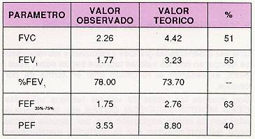 Con valores observados de FVC = 2.26 l.; FEV1 = 1.77 l.; % FEV1, = 78; FEF 25%-75% = 1.75 l/s. ; PEF = 3.53 l/s.
