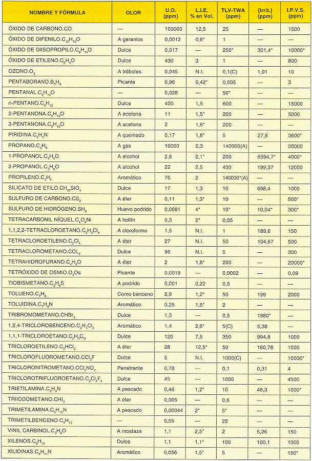Posteriormente se acompañan para esas 216 sustancias los valores de las concentraciones de su U.O.señalados en el año 1986, de 165 L.I.E., de 200 valores T.L.V., 119 [Irrit.] y 102 I.P.V.S., expresadas todos ellos en partes por millón (p.p.m.), excepto el L.I.E. que está expresado en unidades de % de volumen en aire.