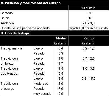 Existen varios tipos de tablas que ofrecen información sobre el consumo de energía durante el trabajo. Unas relacionan, de forma sencilla y directa, el tipo de trabajo con el término M estableciendo trabajos concretos (escribir a máquina, descargar camiones etc.) y dando un valor de M a cada uno de ellos. Otras, como la que se presenta en la tabla 2, determina un valor de M según la posición y movimiento del cuerpo, el tipo de trabajo y el metabolismo basal (6). Este último se considera de 1 Kcal / min como media para la población laboral, y debe añadirse siempre.