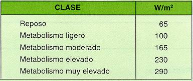 1 w / m2 = 1,553 kcal / hora (para una superficie corporal estándar de 1,8 m2).