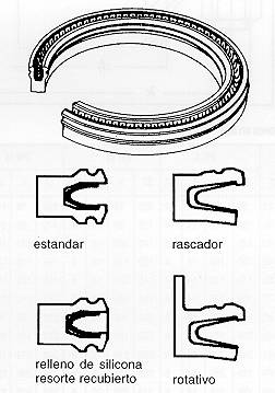 El sellado en este caso, se puede hacer a través de una junta en PTFE (Teflón) con resorte metálico (ver figura 5). Su principio de funcionamiento se basa en su morfología constituida de un cuerpo de doble labio y de un resorte de compresión de alta resiliencia. El doble labio ejerce una compresión importante sobre las dos caras de estanqueidad asegurando así una mejor estanqueidad que las juntas de simple labio. Un cierto volumen del fluido se encuentra aprisionado entre los labios, lo cual permite disminuir el desgaste y prolongar la longevidad de la junta. El cuerpo en PTFE es accionado por un resorte en acero inoxidable que mantiene una tensión suficiente para asegurar la estanqueidad cuando la presión del circuito es débil. Este dispositivo compensa de otra parte la resiliencia relativamente débil del elemento en PTFE sometido a un desgaste normal en aplicaciones dinámicas.