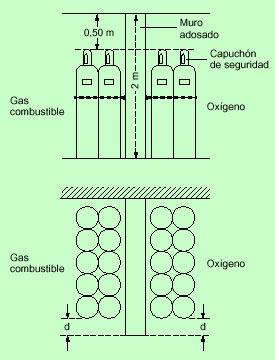 Las botellas de oxígeno y de acetileno deben almacenarse por separado dejando una distancia mínima de 6 m siempre que no haya un muro de separación. En el caso de que exista un muro de separación se pueden distinguir dos casos: