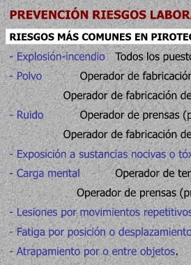 PREVENCIÓN RIESGOS LABORALES: PIROTECNIA En la industria pirotécnica se fabrican, procesan, manipulan, transportan y almacenan productos pirotécnicos. El Reglamento de Explosivos, define artificio pirotécnico como: "los artefactos cargados de mezclas explosivas, generalmente deflagrantes, destinados a producir efecto calorífico, gaseoso o fumígeno, o una combinación de estos efectos, como consecuencia de reacciones químicas autosostenidas no detonantes. Se utilizan con fines recreativos, espectáculos, avisos, meteorología, etc." La actividad pirotécnica es una industria de riesgo, por tanto todos los conceptos relativos a "procesos, actividades, operaciones, equipos o productos peligrosos" tal y como se incluyen en la Ley de Prevención de Riesgos Laborales le son de aplicación. El Reglamento de Servicios de Prevención Anexo I (actividades específicas de mayor peligrosidad) incluye: "las actividades de fabricación y utilización de explosivos, incluidos los artículos pirotécnicos y otros objetos o instrumentos que contengan explosivos".