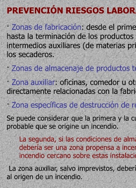 PREVENCIÓN RIESGOS LABORALES: PIROTECNIA El operario de una pirotecnia debe conocer cuál es el mapa de riesgos respecto a la lucha contra incendios en sus instalaciones, es decir: a) Dónde se localizan las zonas de trabajo de la pirotecnia con más riesgo de originar un incendio. En principio, el riesgo de incendio está presente en todos los puestos de trabajo, considerando el tipo de industria implicada. No obstante, debe diferenciarse aquellos puestos de trabajo donde es más probable que se originen estos incendios. b) Cuáles son las actividades más propensas a originar un incendio. c) Cuáles son los materiales o sustancias con más riesgo de originar un incendio. LUCHA CONTRA INCENDIOS