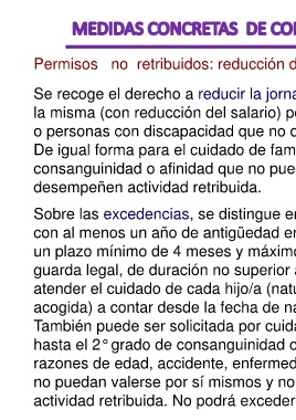 Permisos no retribuidos: reducción de jornada y excedencias. Se recoge el derecho a reducir la jornada entre un octavo y la mitad de la misma (con reducción del salario) por cuidado de menores de 8 años o personas con discapacidad que no desempeñen actividad retribuida. De igual forma para el cuidado de familiares hasta el 2° grado de consanguinidad o afinidad que no puedan valerse por sí mismos y no desempeñen actividad retribuida. Sobre las excedencias, se distingue entre una voluntaria, con al menos un año de antigüedad en la empresa y por un plazo mínimo de 4 meses y máximo de 5 años, y por guarda legal, de duración no superior a los 3 años para atender el cuidado de cada hijo/a (natural, adopción o acogida) a contar desde la fecha de nacimiento. También puede ser solicitada por cuidado de familiares hasta el 2° grado de consanguinidad o afinidad, que por razones de edad, accidente, enfermedad o discapacidad no puedan valerse por sí mismos y no desempeñen actividad retribuida. No podrá exceder los 2 años.
