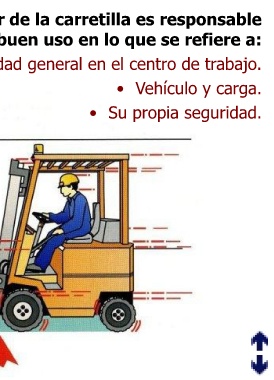 El conductor de la carretilla es responsable de su buen uso en lo que se refiere a: • Seguridad general en el centro de trabajo. • Vehículo y carga. • Su propia seguridad. VELOCIDAD CIRCULACION