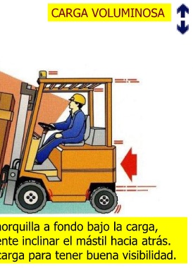 CARGA VOLUMINOSA Recoger el material introducido la horquilla a fondo bajo la carga, elevarla unos 15 cm e inmediatamente inclinar el mástil hacia atrás. Limitar el tamaño y la altura de la carga para tener buena visibilidad.