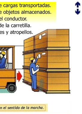 RIESGOS Caída de cargas transportadas. Caída de objetos almacenados. Caída del conductor. Vuelco de la carretilla. Colisiones y atropellos. VER SENTIDO MARCHA