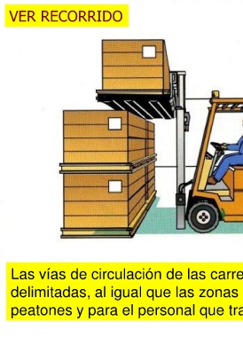 RIESGOS Caída de cargas transportadas. Caída de objetos almacenados. Caída del conductor. Vuelco de la carretilla. Colisiones y atropellos. VER SENTIDO MARCHA