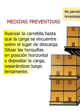 CAIDA CARGA Situar la carretilla frente al lugar previsto y en exposición precisa para depositar la carga. MEDIDAS Elevar la carga hasta la altura necesaria PREVENTIVAS manteniendo la carretilla frenada.