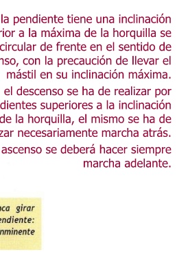 GIRO EN PENDIENTE • Si la pendiente tiene una inclinación inferior a la máxima de la horquilla se podrá circular de frente en el sentido de descenso, con la precaución de llevar el mástil en su inclinación máxima. • Si el descenso se ha de realizar por pendientes superiores a la inclinación máxima de la horquilla, el mismo se ha de realizar necesariamente marcha atrás. • El ascenso se deberá hacer siempre marcha adelante.