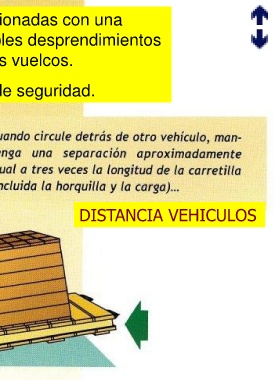 Las carretillas deben estar acondicionadas con una estructura de protección ante posibles desprendimientos de materiales y también de posibles vuelcos. Es obligatorio emplear el cinturón de seguridad. DISTANCIA VEHICULOS