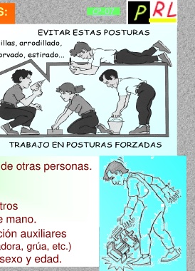 CARGAS o POSICIONES FORZADAS: CP-07 - Alzando y transportando cargas. - Muy doblado o inclinado. - Agachado, tendido. - Con los brazos en alto. - En espacios estrechos. • Cargar o transportar pesos pegándolos al cuerpo y en posición erguida. • Alzar y transportar cargas con ayuda de otras personas. • Disminuir el peso de las cargas. • Posibilitar los cambios de posturas. • Colocar la herramienta de trabajo y otros medios de trabajo al alcance de mano. • Utilizar medios de transporte o elevación auxiliares (ej. Carro de transporte, gatos, mesa elevadora, grúa, etc.) • Respetar las cargas máximas según sexo y edad.