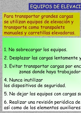 CARGAS o POSICIONES FORZADAS: CP-07 - Alzando y transportando cargas. - Muy doblado o inclinado. - Agachado, tendido. - Con los brazos en alto. - En espacios estrechos. • Cargar o transportar pesos pegándolos al cuerpo y en posición erguida. • Alzar y transportar cargas con ayuda de otras personas. • Disminuir el peso de las cargas. • Posibilitar los cambios de posturas. • Colocar la herramienta de trabajo y otros medios de trabajo al alcance de mano. • Utilizar medios de transporte o elevación auxiliares (ej. Carro de transporte, gatos, mesa elevadora, grúa, etc.) • Respetar las cargas máximas según sexo y edad.